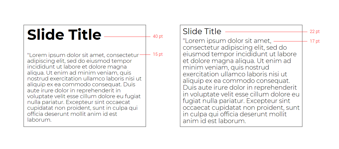 На иллюстрации слева общий текст написан пятнадцатым кеглем, а справа – семнадцатым. И тот, и другой визуально достаточно крупные и хорошо читаются. Но из-за отсутствия контраста между текстом и заголовком глазу становится сложнее выделить главное (то есть заголовок слайда).